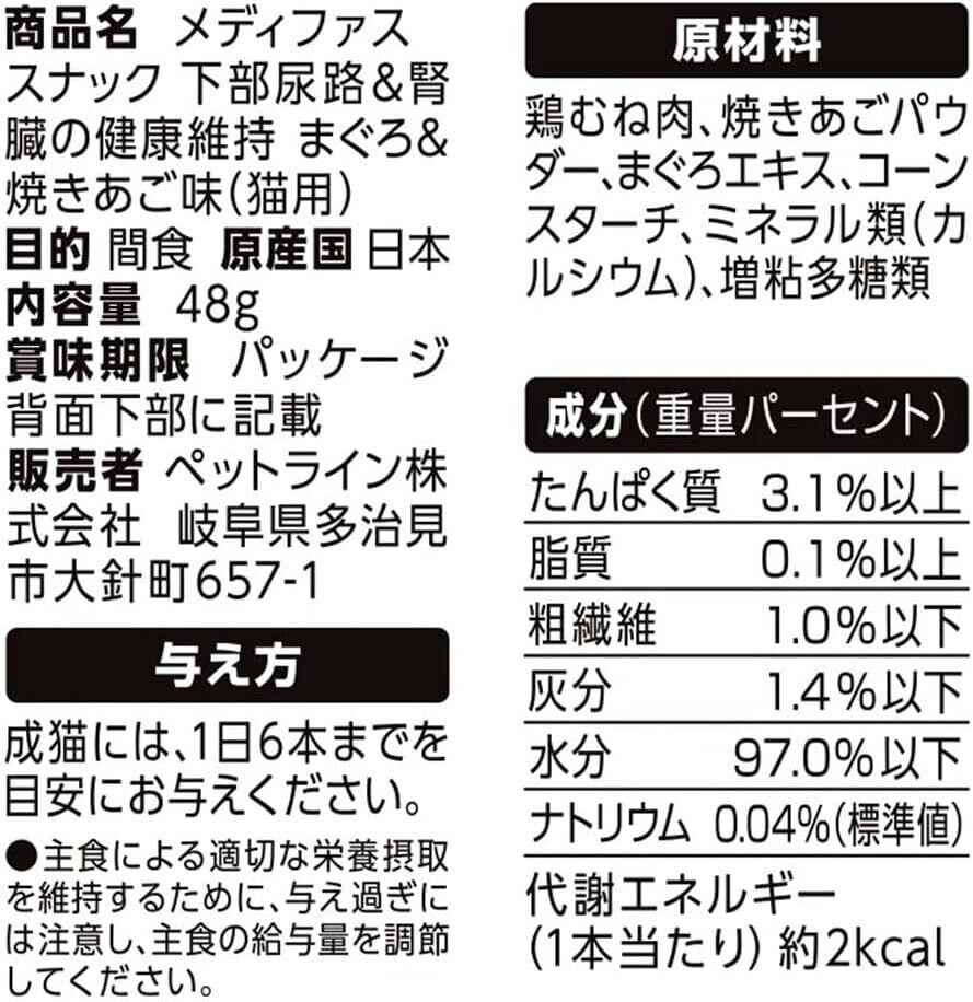 愛猫の健康を第一に考えた栄養設計です。このメディファスは、まぐろと焼きあごの豊かな風味が愛猫の食欲をそそり、健康をサポートします!毎日の楽しいおやつタイムを実現するために、ぜひお試しください!