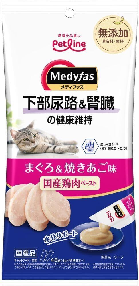 すべての猫種に自信を持ってお届けする【ペットライン(PETLINE)】メディファス 下部尿路&腎臓の健康維持 まぐろ&焼きあご味 48g。この商品で愛猫との特別な時間を育んでください!