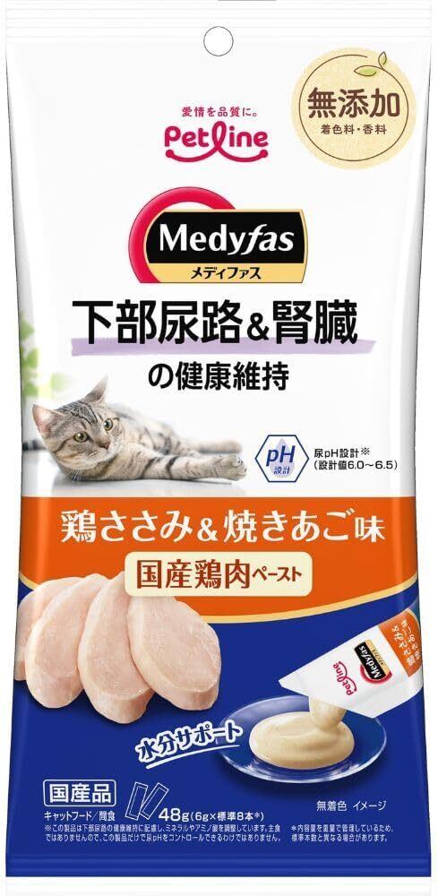 すべての猫種に自信を持ってお届けする【ペットライン(PETLINE)】メディファス 下部尿路&腎臓の健康維持 鶏ささみ&焼きあご味 48g。この商品で愛猫との特別な時間を育んでください!