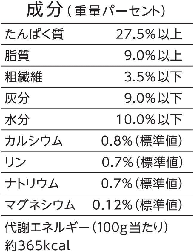 穀類(とうもろこし、小麦粉、コーングルテンミール)、肉類(ミートミール、チキンミール、チキンレバーパウダー、銘柄鶏(ささみ))、豆類(脱脂大豆)、油脂類(動物性油脂)、魚介類(フィッシュエキス、白身魚エキス、しらす、かつお枯れ節削り、まぐろ節)、乳類(チーズ)、セレン酵母、ビタミン類(A、D₃、E、K₃、B₁、B₂、パントテン酸、ナイアシン、B₆、葉酸、ビオチン、B₁₂、コリン、イノシトール)、ミネラル類(カルシウム、リン、ナトリウム、カリウム、塩素、鉄、コバルト、銅、マンガン、亜鉛、ヨウ素)、アミノ酸類(メチオニン、タウリン)、クチナシ色素、酸化防止剤(ローズマリー抽出物、ミックストコフェロール)