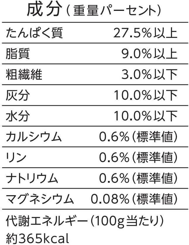 穀類(とうもろこし、コーングルテンミール、小麦粉)、肉類(ミートミール、チキンレバーパウダー、銘柄鶏(ささみ))、油脂類(動物性油脂)、魚介類(フィッシュエキス、白身魚エキス、うるめ煮干削り、熟成まぐろ、熟成かつお)、乳類(チーズ)、セレン酵母、ビタミン類(A、D₃、E、K₃、B₁、B₂、パントテン酸、ナイアシン、B₆、葉酸、ビオチン、B₁₂、コリン、イノシトール)、ミネラル類(カルシウム、リン、ナトリウム、カリウム、塩素、鉄、コバルト、銅、マンガン、亜鉛、ヨウ素)、アミノ酸類(メチオニン、トリプトファン、タウリン)、クチナシ色素、酸化防止剤(ローズマリー抽出物、ミックストコフェロール)
