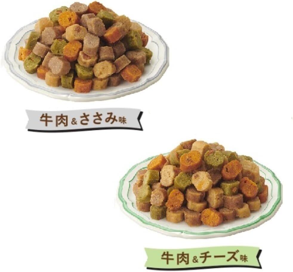 ■素材・成分:穀類(小麦粉、小麦グルテン、脱脂米糠)、肉類(鶏肉、鶏ささみ、鶏軟骨、牛肉)、脱脂大豆、糖類(砂糖、異性化糖、オリゴ糖)、油脂類(動物性油脂、植物性油脂、フィッシュオイル、米胚芽油)、フィッシュエキス、野菜類(パプリカ、ほうれん草パウダー、にんじん)、ビール酵母、チーズ、コラーゲン、N?アセチルグルコサミン、CoQ10、プロピレングリコール、ミネラル類(カルシウム、リン、鉄、銅、亜鉛、ヨウ素)、ビタミン類(A、D、E、B1、B2、B6、B12、パントテン酸、ナイアシン、葉酸、コリン、イノシトール)、膨脹剤、グリセリン、リン酸塩(Na)、保存料(ソルビン酸カリウム)、酸化防止剤(ビタミンC)