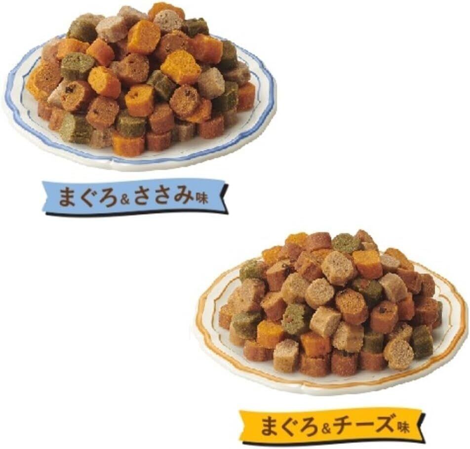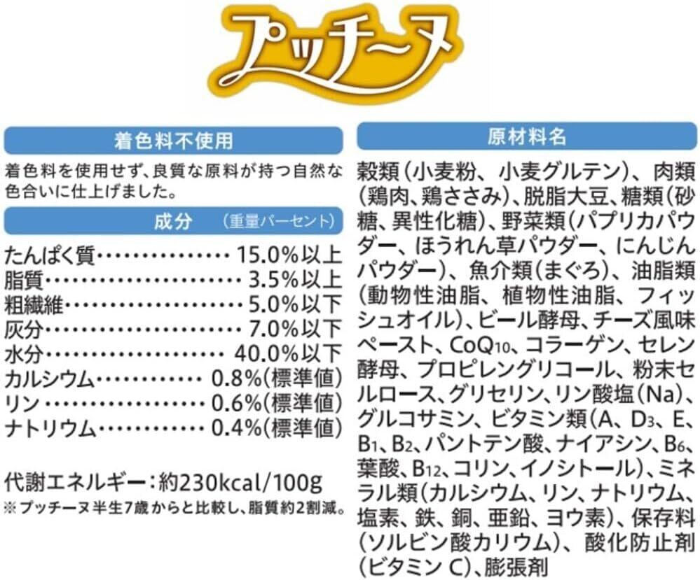 ■素材・成分:穀類(小麦粉、小麦グルテン、脱脂米糠)、肉類(鶏肉、鶏ささみ)、脱脂大豆、糖類(砂糖、異性化糖、オリゴ糖)、粉末セルロース、魚介類(まぐろ、フィッシュエキス)、野菜類(パプリカ、ほうれん草パウダー、にんじん)、油脂類(動物性油脂、植物性油脂、フィッシュオイル、米胚芽油)、ビール酵母、チーズ、コラーゲン、N?アセチルグルコサミン、CoQ10、プロピレングリコール、ミネラル類(カルシウム、リン、鉄、銅、亜鉛、ヨウ素)、ビタミン類(A、D、E、B1、B2、B6、B12、パントテン酸、ナイアシン、葉酸、コリン、イノシトール)、グリセリン、リン酸塩(Na)、保存料(ソルビン酸カリウム)、膨脹剤、酸化防止剤(ビタミンC)