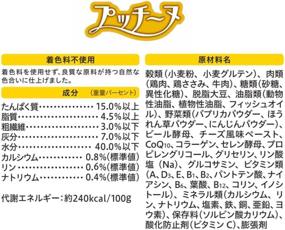 ■素材・成分:穀類(小麦粉、小麦グルテン、脱脂米糠)、肉類(鶏肉、鶏ささみ、牛肉)、糖類(砂糖、異性化糖、オリゴ糖)、脱脂大豆、フィッシュエキス、野菜類(パプリカ、ほうれん草パウダー、にんじん)、油脂類(動物性油脂、植物性油脂、フィッシュオイル、米胚芽油)、ビール酵母、チーズ、コラーゲン、N?アセチルグルコサミン、CoQ10、プロピレングリコール、ミネラル類(カルシウム、リン、鉄、銅、亜鉛、ヨウ素)、ビタミン類(A、D、E、B1、B2、B6、B12、パントテン酸、ナイアシン、葉酸、コリン、イノシトール)、グリセリン、リン酸塩(Na)、保存料(ソルビン酸カリウム)、膨脹剤、酸化防止剤(ビタミンC)