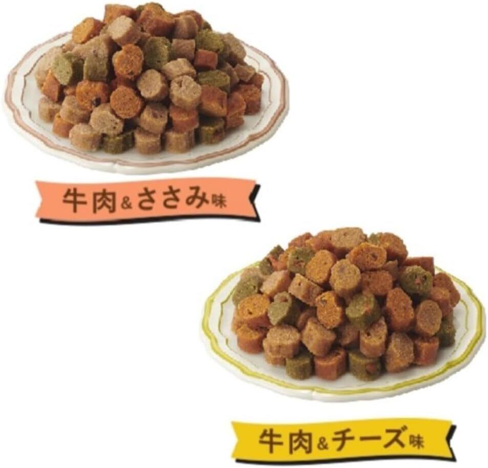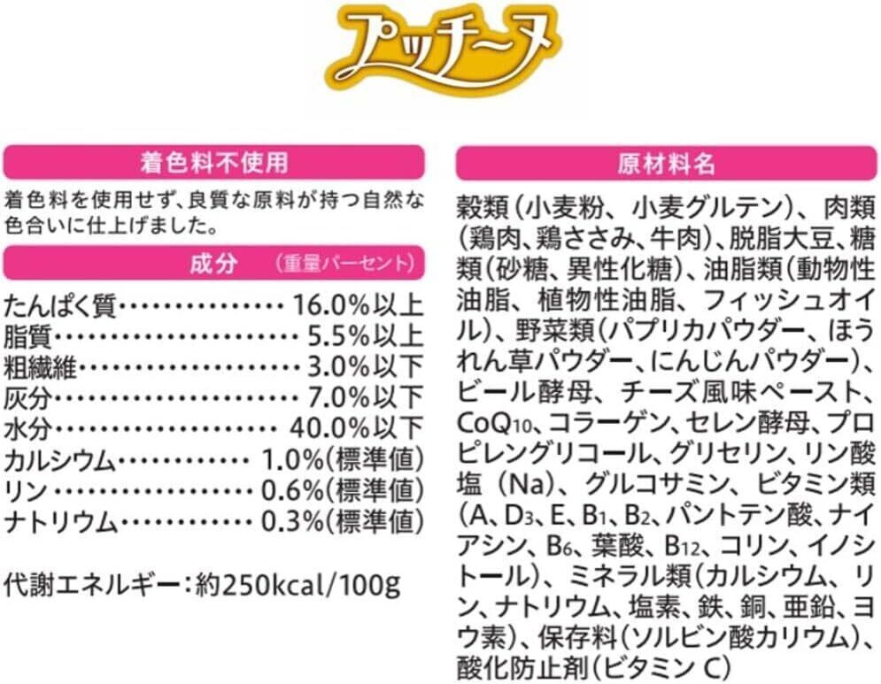 ■素材・成分:穀類(小麦粉、小麦グルテン、脱脂米糠)、肉類(鶏肉、鶏ささみ、牛肉)、脱脂大豆、糖類(砂糖、異性化糖、オリゴ糖)、油脂類(動物性油脂、植物性油脂、フィッシュオイル、米胚芽油)、野菜類(パプリカ、ほうれん草パウダー、にんじん)、魚介類(フィッシュエキス、魚肉抽出物)、ビール酵母、チーズ、コラーゲン、N?アセチルグルコサミン、CoQ10、プロピレングリコール、ミネラル類(カルシウム、リン、鉄、銅、亜鉛、ヨウ素)、ビタミン類(A、D、E、B2、B12、パントテン酸、葉酸、コリン)、グリセリン、リン酸塩(Na)、保存料(ソルビン酸カリウム)、酸化防止剤(ビタミンC)