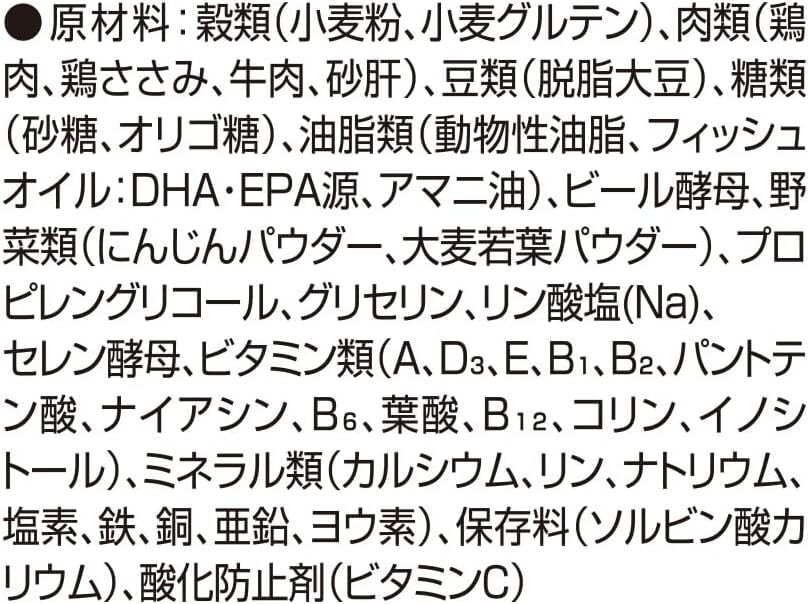 穀類(小麦粉、小麦グルテン)、肉類(鶏肉、鶏ささみ、牛肉、砂肝)、豆類(脱脂大豆)、糖類(砂糖、オリゴ糖)、油脂類(動物性油脂、フィッシュオイル:DHA・EPA源、アマニ油)、ビール酵母、野菜類(にんじんパウダー、大麦若葉パウダー)、プロピレングリコール、グリセリン、リン酸塩(Na)、セレン酵母、ビタミン類(A、D3、E、B1、B2、パントテン酸、ナイアシン、B6、葉酸、B12、コリン、イノシトール)、ミネラル類(カルシウム、リン、ナトリウム、塩素、鉄、銅、亜鉛、ヨウ素)、保存料(ソルビン酸カリウム)、酸化防止剤(ビタミンC)