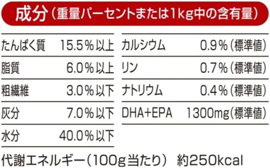 穀類(小麦粉、小麦グルテン)、肉類(鶏肉、鶏ささみ、砂肝)、豆類(脱脂大豆)、糖類(砂糖、オリゴ糖)、油脂類(動物性油脂、フィッシュオイル:DHA・EPA源、アマニ油)、ビール酵母、野菜類(にんじんパウダー、大麦若葉パウダー)、プロピレングリコール、グリセリン、リン酸塩(Na)、セレン酵母、ビタミン類(A、D3、E、B1、B2、パントテン酸、ナイアシン、B6、葉酸、B12、コリン、イノシトール)、ミネラル類(カルシウム、リン、ナトリウム、塩素、鉄、銅、亜鉛、ヨウ素)、保存料(ソルビン酸カリウム)、酸化防止剤(ビタミンC)、膨張剤
