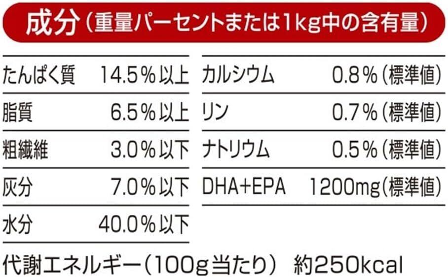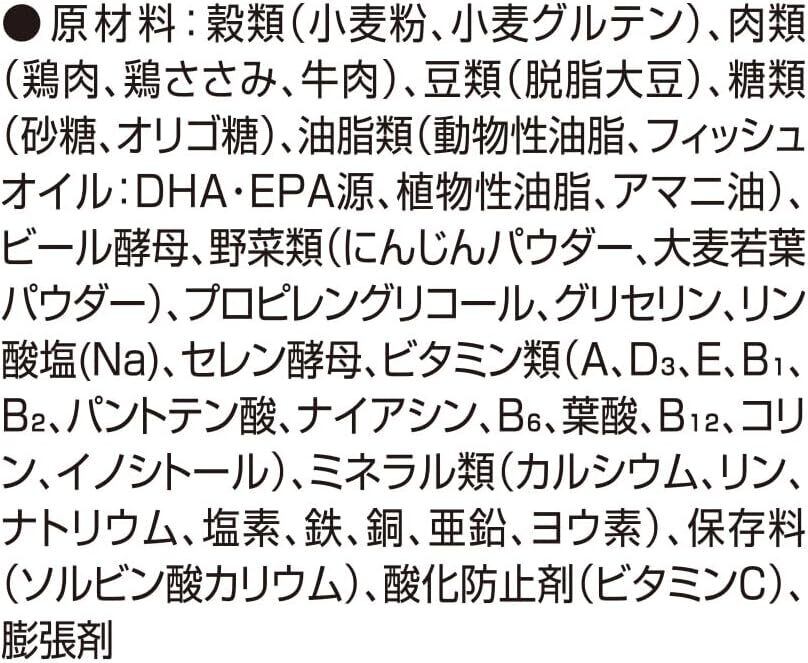 穀類(小麦粉、小麦グルテン)、肉類(鶏肉、鶏ささみ、牛肉)、豆類(脱脂大豆)、糖類(砂糖、オリゴ糖)、油脂類(動物性油脂、フィッシュオイル:DHA・EPA源、植物性油脂、アマニ油)、ビール酵母、野菜類(にんじんパウダー、大麦若葉パウダー)、プロピレングリコール、グリセリン、リン酸塩(Na)、セレン酵母、ビタミン類(A、D3、E、B1、B2、パントテン酸、ナイアシン、B6、葉酸、B12、コリン、イノシトール)、ミネラル類(カルシウム、リン、ナトリウム、塩素、鉄、銅、亜鉛、ヨウ素)、保存料(ソルビン酸カリウム)、酸化防止剤(ビタミンC)、膨張剤