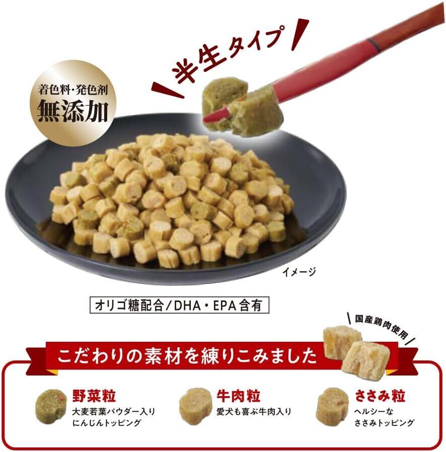 牛肉トッピングとささみトッピングがそれぞれ練りこまれた「牛肉粒」と「ささみ粒」。ささみ粒は噛みやすいふんわり設計。オリゴ糖が腸内フローラを整え、健康を維持する。