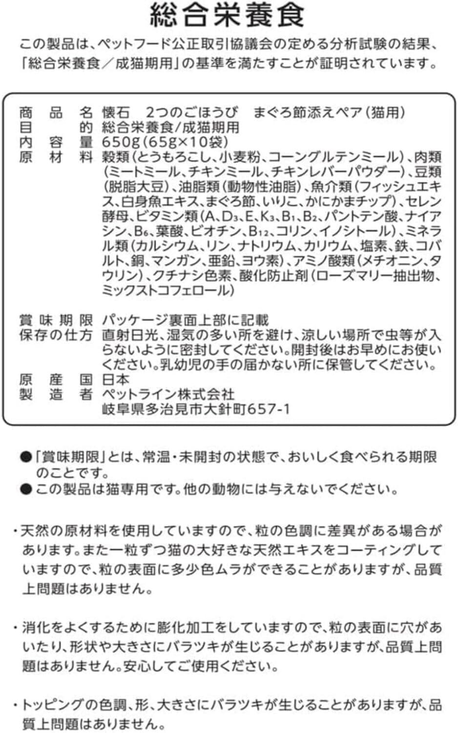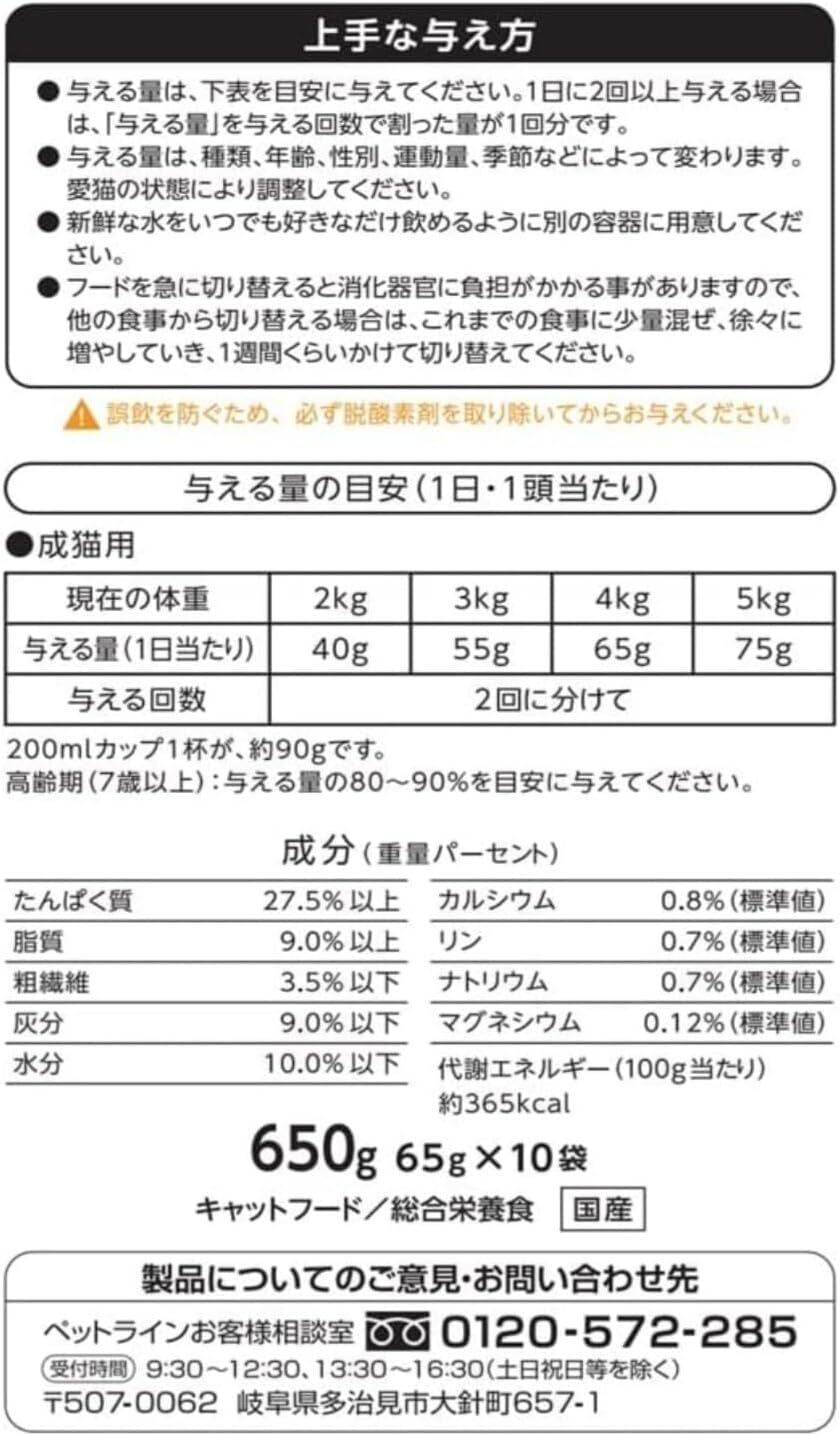 穀類(とうもろこし、小麦粉、コーングルテンミール)、肉類(ミートミール、チキンミール、チキンレバーパウダー)、豆類(脱脂大豆)、油脂類(動物性油脂)、魚介類(フィッシュエキス、白身魚エキス、まぐろ節、いりこ、かにかまチップ)、セレン酵母、ビタミン類(A、D₃、E、K₃、B₁、B₂、パントテン酸、ナイアシン、B₆、葉酸、ビオチン、B₁₂、コリン、イノシトール)、ミネラル類(カルシウム、リン、ナトリウム、カリウム、塩素、鉄、コバルト、銅、マンガン、亜鉛、ヨウ素)、アミノ酸類(メチオニン、タウリン)、クチナシ色素、酸化防止剤(ローズマリー抽出物、ミックストコフェロール)