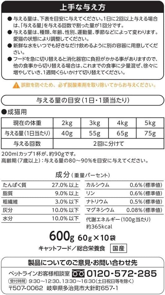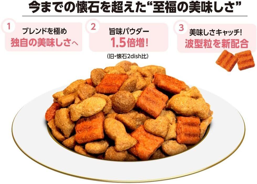 今までの懐石を超える”至福の美味しさ”。お肉とお魚味の粒に、厳選したトッピングを添えて飽きのこない味わいに仕上げました。トッピングされた2種のアルミ蒸着分包が60g×10パック入りで美味しさをキープ。酸化を防ぎ風味を保つ脱酸素剤入り。