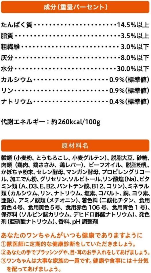 ■素材・成分:穀類(小麦粉、とうもろこし、小麦グルテン)、脱脂大豆、砂糖、肉類(鶏肉、鶏ささみ、鶏レバー)、ビーフオイル、脱脂粉乳、かぼちゃ粉末、酵母、プロピレングリコール、ミネラル類(カルシウム、リン、ナトリウム、塩素、銅、亜鉛、ヨウ素、コバルト)、ソルビトール、加工でんぷん、pH調整剤、グリセリン、保存料(ソルビン酸カリウム、デヒドロ酢酸ナトリウム)、リン酸塩(Na)、ビタミン類(A、D、E、B2、B12、パントテン酸、コリン)、香料、着色料(二酸化チタン、食用黄色4号、食用黄色5号、食用赤色106号、食用青色1号)、発色剤(亜硝酸ナトリウム)
