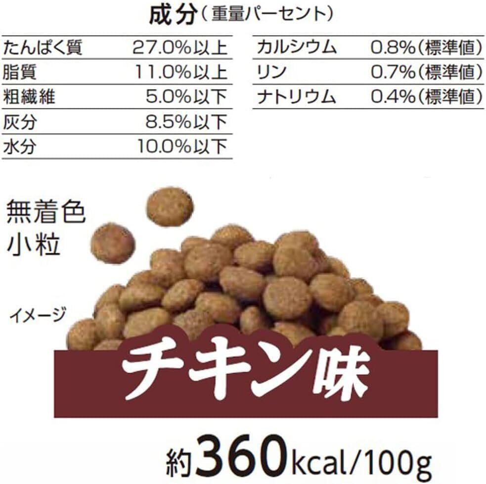 ■素材・成分:穀類(とうもろこし、コーングルテンフィード、小麦ふすま、米ぬか)、豆類(脱脂大豆、おから)、肉類(ミートミール、チキンミール、チキンレバーパウダー)、油脂類(動物性油脂)、魚介類(フィッシュミール)、糖類(フラクトオリゴ糖)、セレン酵母、乳酸菌エキス、納豆菌エキス、酵母菌エキス、ビタミン類(A、D3、E、K3、B1、B2、パントテン酸、ナイアシン、B6、葉酸、ビオチン、B12、C、コリン)、ミネラル類(カルシウム、ナトリウム、塩素、鉄、コバルト、銅、マンガン、亜鉛アミノ酸複合体、亜鉛、ヨウ素)、酸化防止剤(ローズマリー抽出物、ミックストコフェロール)