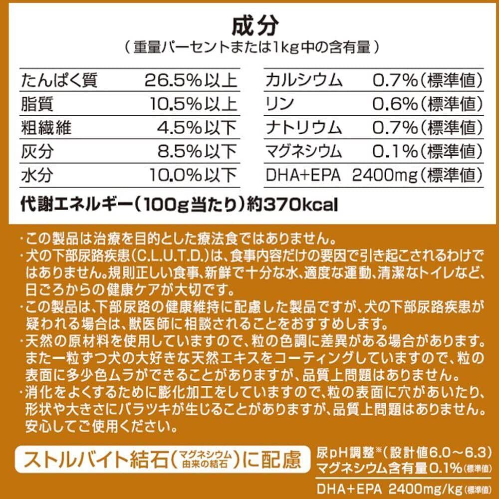 愛犬の尿石対策を考えた特別設計が自慢です!尿のpHを適正に保つために、こだわりの成分が含まれており、健康を維持するためのサポートを行います。さらに、必要な栄養素をバランスよく配合しているので、安心して与えられるフードです。